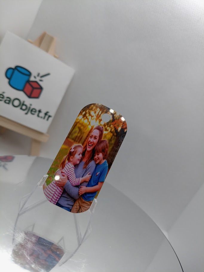 La plaque peut également servir de porte-clés (dimensions : 2,8 × 5,8 cm). Elle peut se porter en chaîne ou en porte-clés, avec ou sans système de fixation.